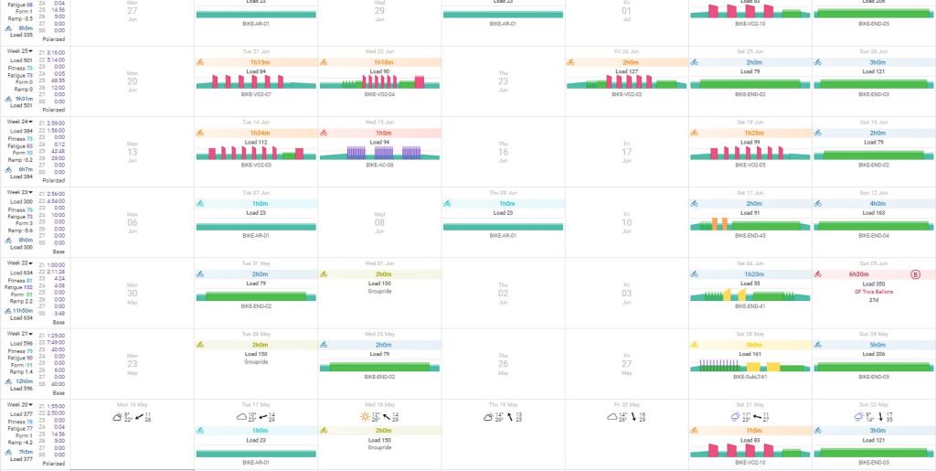 Idealiter maak ik een schema met trainingsblokken van 2-4 weken. Deze blokken zijn ingedeeld in een startweek, een doorbouwweek, een piekweek en een herstelweek. Natuurlijk kan het zo zijn dat dit niet perfect uitkomt met de piekmomenten, dan kan er gekeken worden naar een andere indeling.
